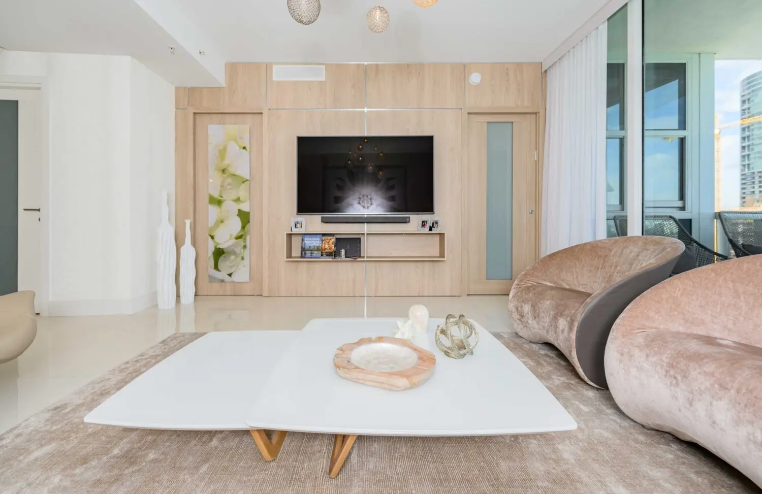 The entire apartment is a celebration of light, movement, and emotion. The open-concept layout was designed to welcome the tropical sun and showcase panoramic views of the Atlantic Ocean. Inspired by the colors of sunrise and the textures of coastal nature, the palette features airy neutrals, soft sands, and whites. Playful patterns, luxurious materials, and top-of-the-line furnishings create a soothing, sophisticated ambiance.